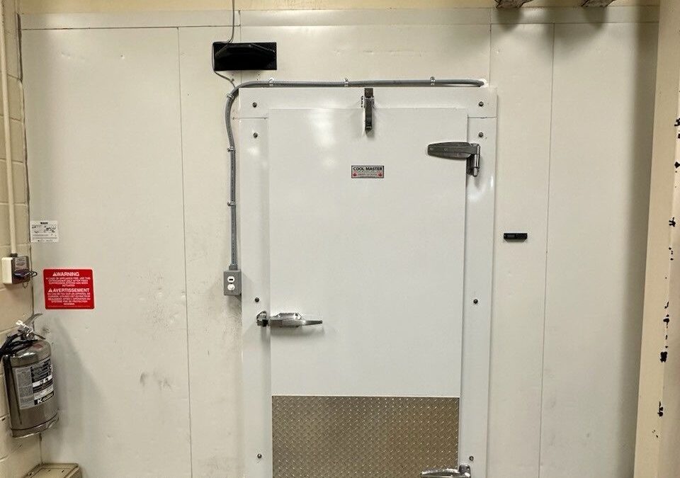 We worked with the end user to design and install a complete walk-in cooler construction door. The existing floor concrete curb had to be addressed with this retrofit . We went to site, measured , prepared a drawing for the door manufacturer. Once we got the the drawing we went to site again and measured the door , compared to the drawing to ensure an exact fit. Measure twice, cut once ensures a perfect fit on retrofits.