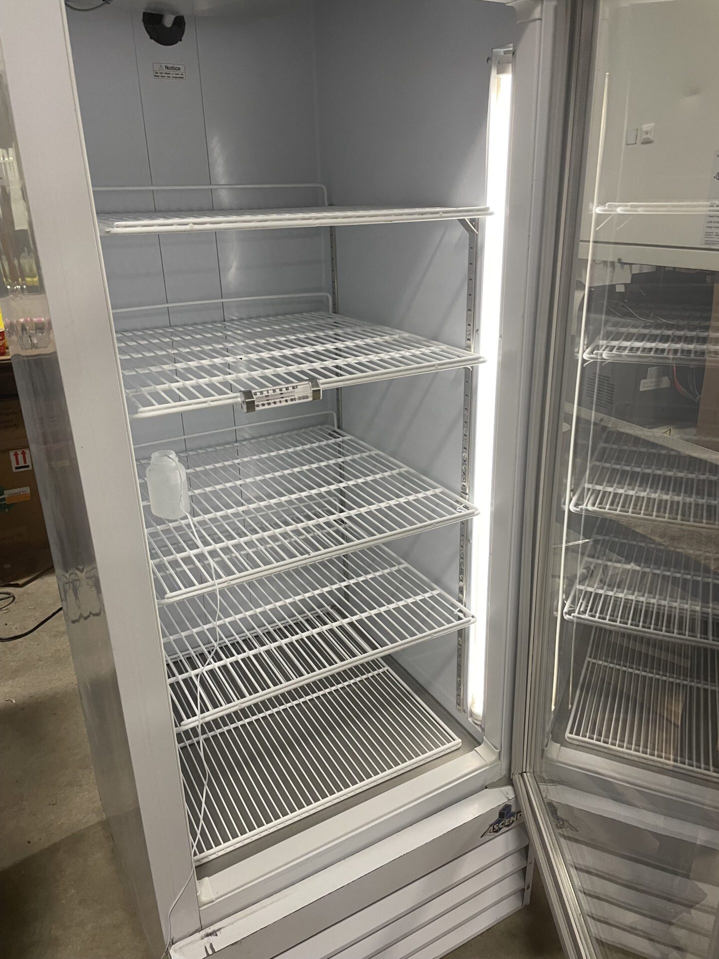Description: Refurbished Single Door Sliding door cooler. 5 Shelves. Re-charged refrigerant, leak tested, Runs smoothly.